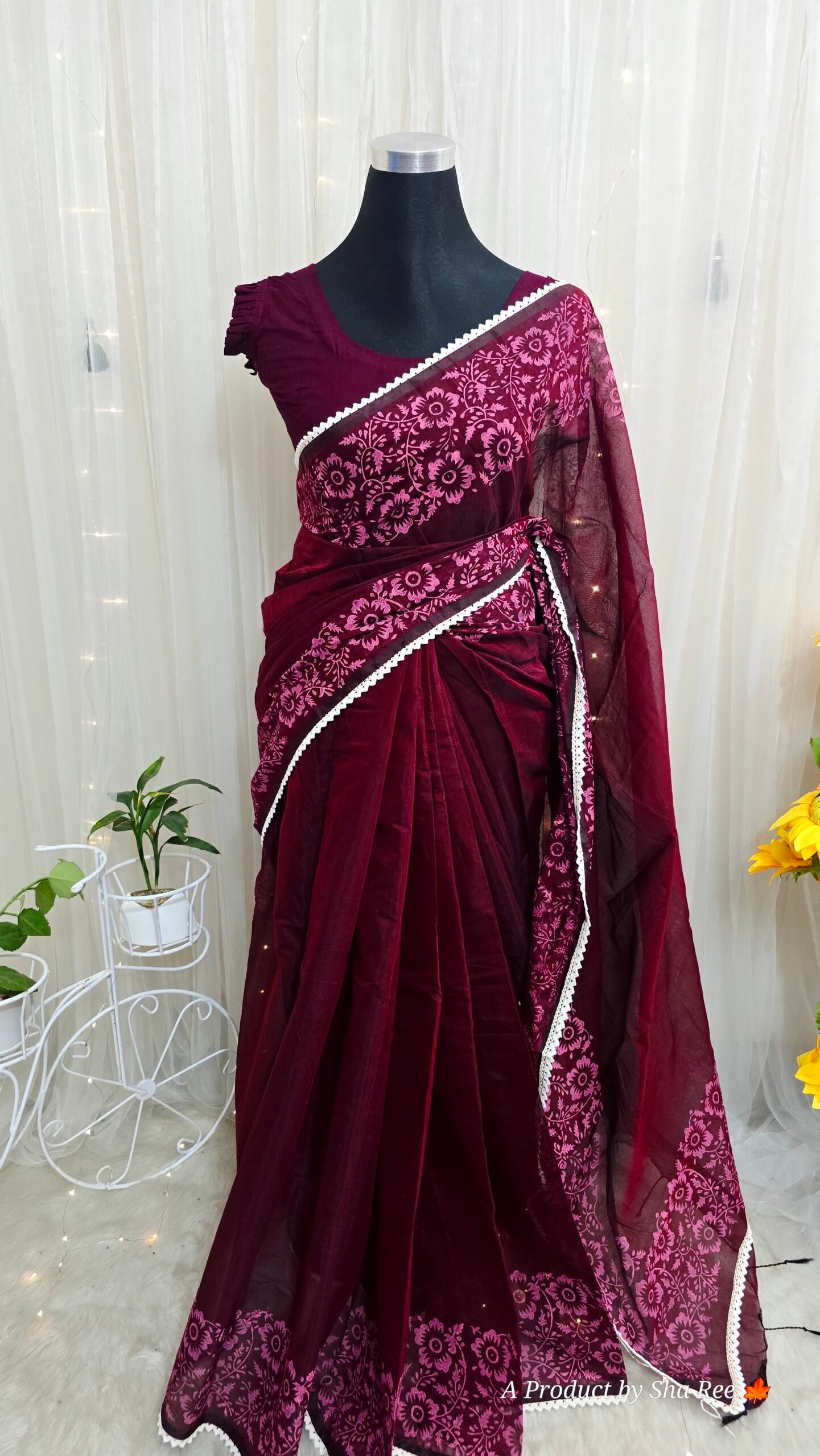 স্ট্যান্ডার্ড শাড়ী হয় ১২ হাত। আমরা ১৩.৫ থেকে ১৪.৫ হাত পরিমান কাপড় দিয়েছি যেনো কেউ চাইলে ব্লাউজ বানাতে পারে। এই এক্সট্রা কাপড়টুকু কাটা থাকবেনা, এটাচড থাকবে। যাদের শাড়ীতে এক্সট্রা কুঁচি ভালো লাগে তাদের জন্য এটা বেশ ভালো হয়❤️